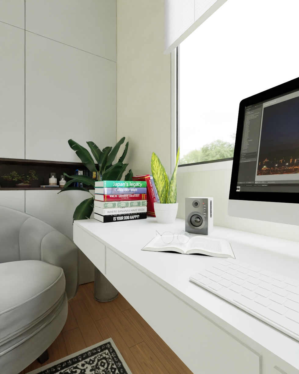 Dividing Dreams: Crafting harmony through fluted elegance. Introducing our bedroom design featuring a sophisticated fluted wall panel, seamlessly partitioning space between a tranquil bedroom and an inspiring study area. Experience the art of balance and purposeful design, where functionality meets style